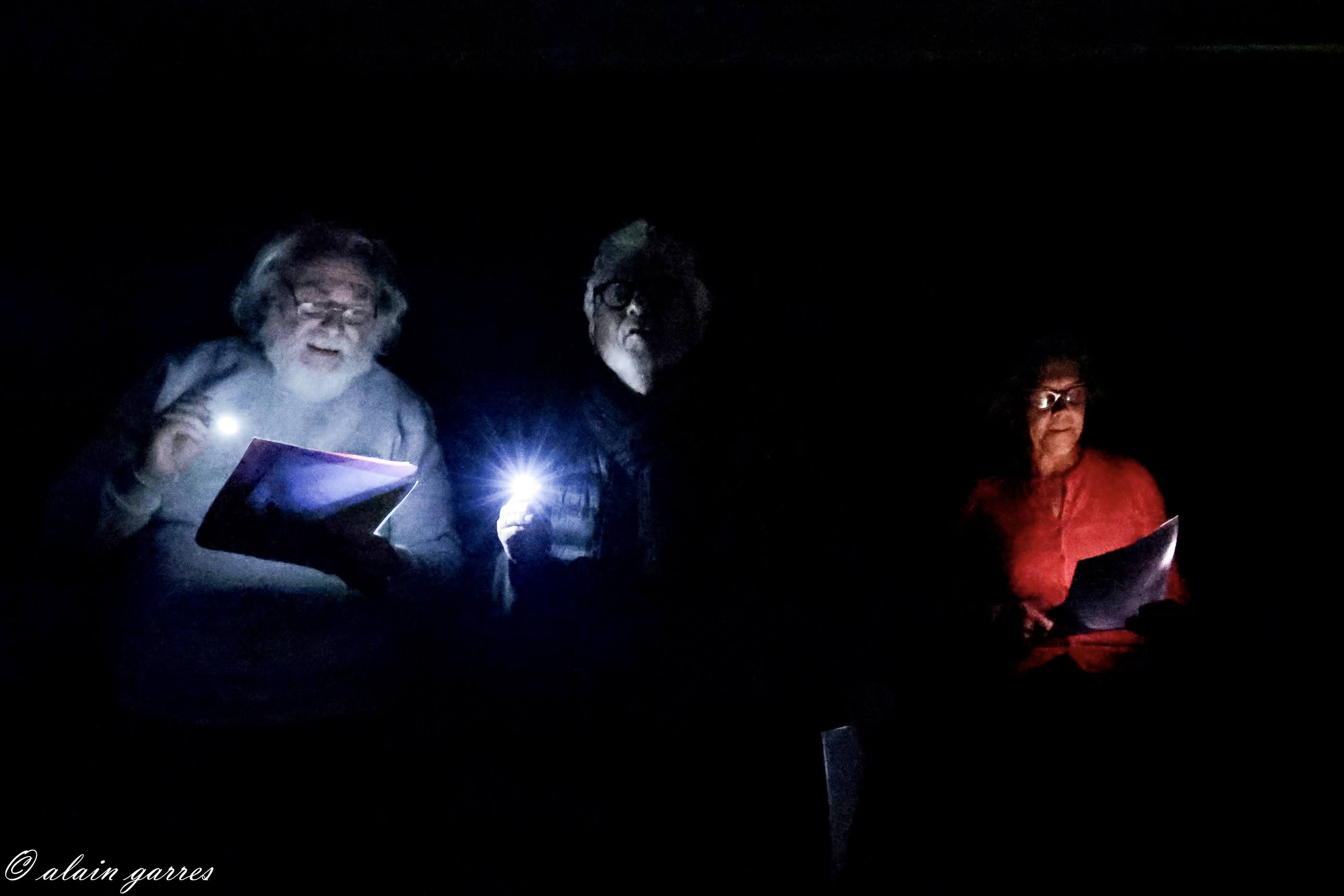 Emportés par une ferveur théâtrale nous en avons quelque peu oublié des conditions matérielles parfois difficiles. La salle de restauration des troupes s’est retrouvée réduite à 3 barnums. Heureusement les températures étaient douces ! Mais avec un jour de pluie et des barnums inondés ce qui nous a amenés à improviser lors des repas.